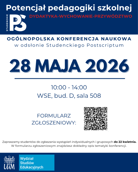 Weź udział w Studenckim Postscriptum! To studencka konferencja naukowa w ramach Ogólnopolskiej Konferencji Naukowej Potencjał pedagogiki szkolnej. Dydaktyka-Wychowanie-Przywództwo. 👩🏻🏫👨🏼🏫🧑🏻🏫