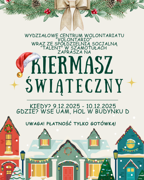 Wydziałowe Centrum Wolontariatu VOLONTARIO serdecznie zaprasza na coroczny Kiermasz Bożonarodzeniowy, który odbędzie się w dniach 9–10 grudnia w hallu budynku D.