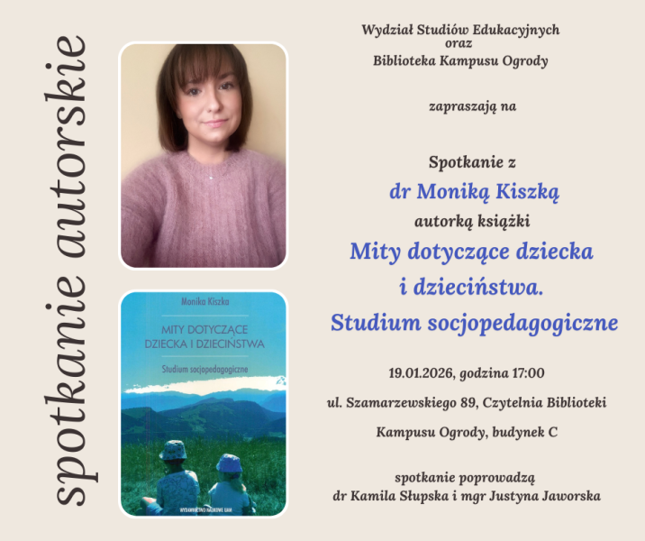 Wydział Studiów Edukacyjnych UAM oraz Biblioteka Kampusu Ogrody serdecznie zapraszają na spotkanie z dr Moniką Kiszką, autorką książki "Mity dotyczące dziecka i dzieciństwa. Studium socjopedagogiczne".