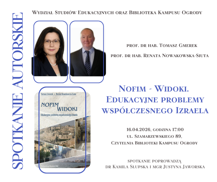 Wydział Studiów Edukacyjnych UAM oraz Biblioteka Kampusu Ogrody serdecznie zapraszają na spotkanie z prof. dr. hab. Tomaszem Gmerkiem i prof. dr hab. Renatą Nowakowską-Siutą, autorami książki „Nofim - Widoki. Edukacyjne problemy współczesnego Izraela”.